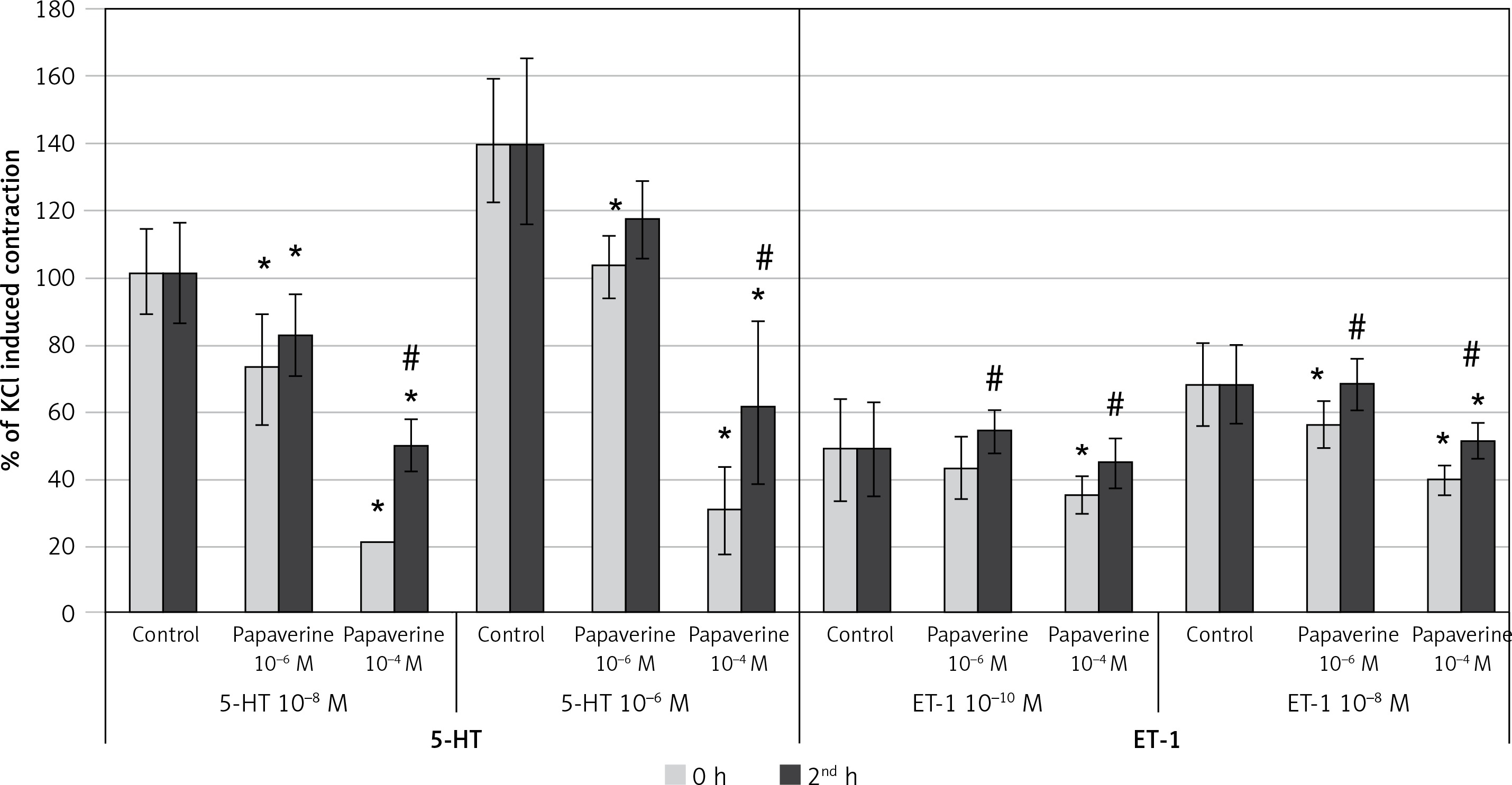 Effects of papaverine pretreatment on constriction elicited by 5-HT and ET-1 on internal mammary artery rings. Pap: papaverine, results are expressed as percentage of KCl-induced control contraction (mean ± SD). *P < 0.05 vs. control and #p < 0.05 vs. 0 h