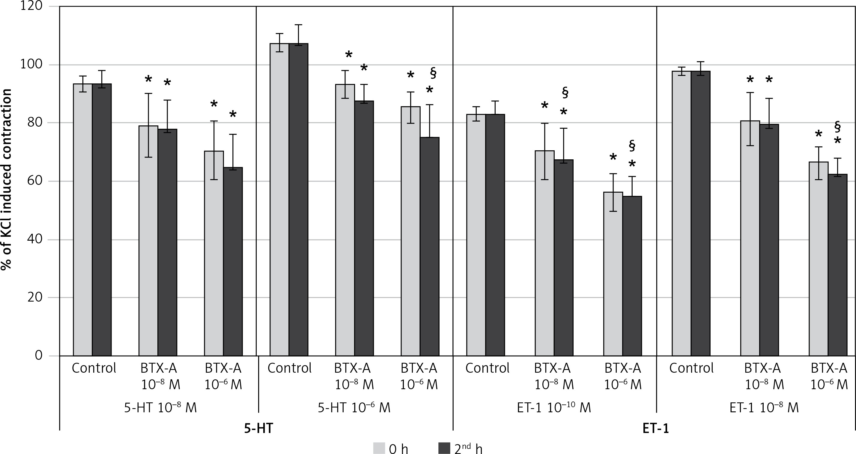 Effects of botulinum toxin A pretreatment on constriction elicited by 5-HT and ET-1 on internal mammary artery rings. Results are expressed as percentage of KCl-induced control contraction (mean ± SD). *P < 0.05 vs. control and §p < 0.05 vs. 0 h