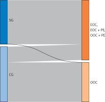 Sankey diagram – the distribution of endometriosis in the study group (SG = 45), the control group (CG = 56). Endometriosis = EOC + (EOC + PE) + (OOC + PE)
