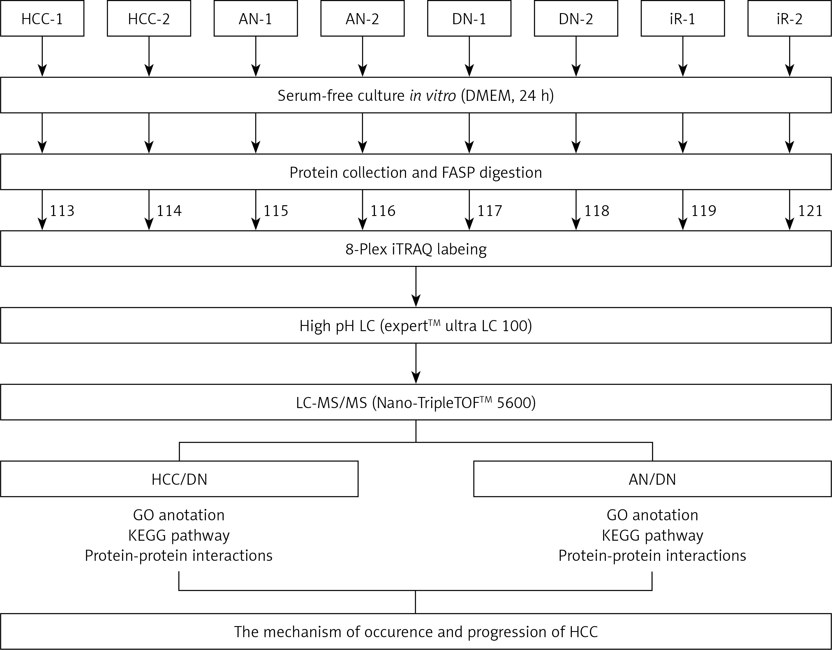 A schematic view of the experimental design and the isobaric tags for relative and absolute quantification (iTRAQ) 8 plex-labelling. Sample preparation procedures for shotgun mass spectrometry (MS/MS) analysis and important steps in the proteomic strategies were included. The tissues from the primary hepatocellular carcinoma (HCC) patients were divided into 3 groups: HCC group, adjacent noncancerous group, and dendritic cell group. Different tissues were cultured in a serum-free medium and the proteins were extracted from the cultural supernatant and then digested by trypsin and labelled by different iTRAQ reagents. The digested peptides were separated by high pH reversed-phase liquid chromatography (LC) and analysed by LC-MS/MS