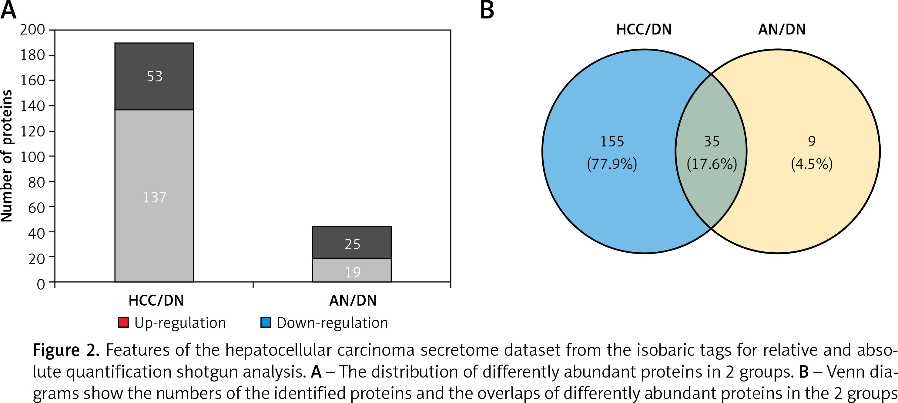 Features of the hepatocellular carcinoma secretome dataset from the isobaric tags for relative and absolute quantification shotgun analysis. A – The distribution of differently abundant proteins in 2 groups. B – Venn diagrams show the numbers of the identified proteins and the overlaps of differently abundant proteins in the 2 groups