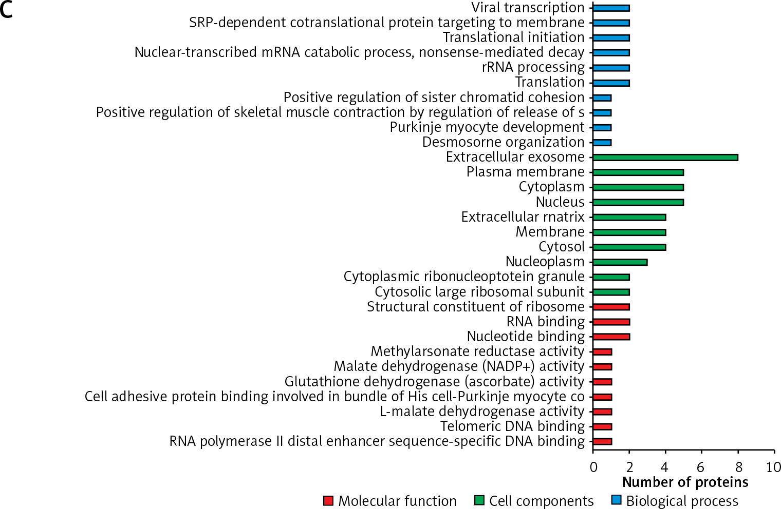 Interestingly, there were 9 dysregulated proteins in the AN group compared to the DN group, but they were not dysregulated in the HCC group compared to the DN group. The gene ontology results also showed that these dysregulated proteins were mainly involved in desmosome organisation, positive regulation of sister chromatid cohesion, translation, rRNA processing, nuclear-transcribed mRNA catabolic process, translational initiation, and SRP-dependent co-translational protein targeting to the membrane (Figure 3 C).
