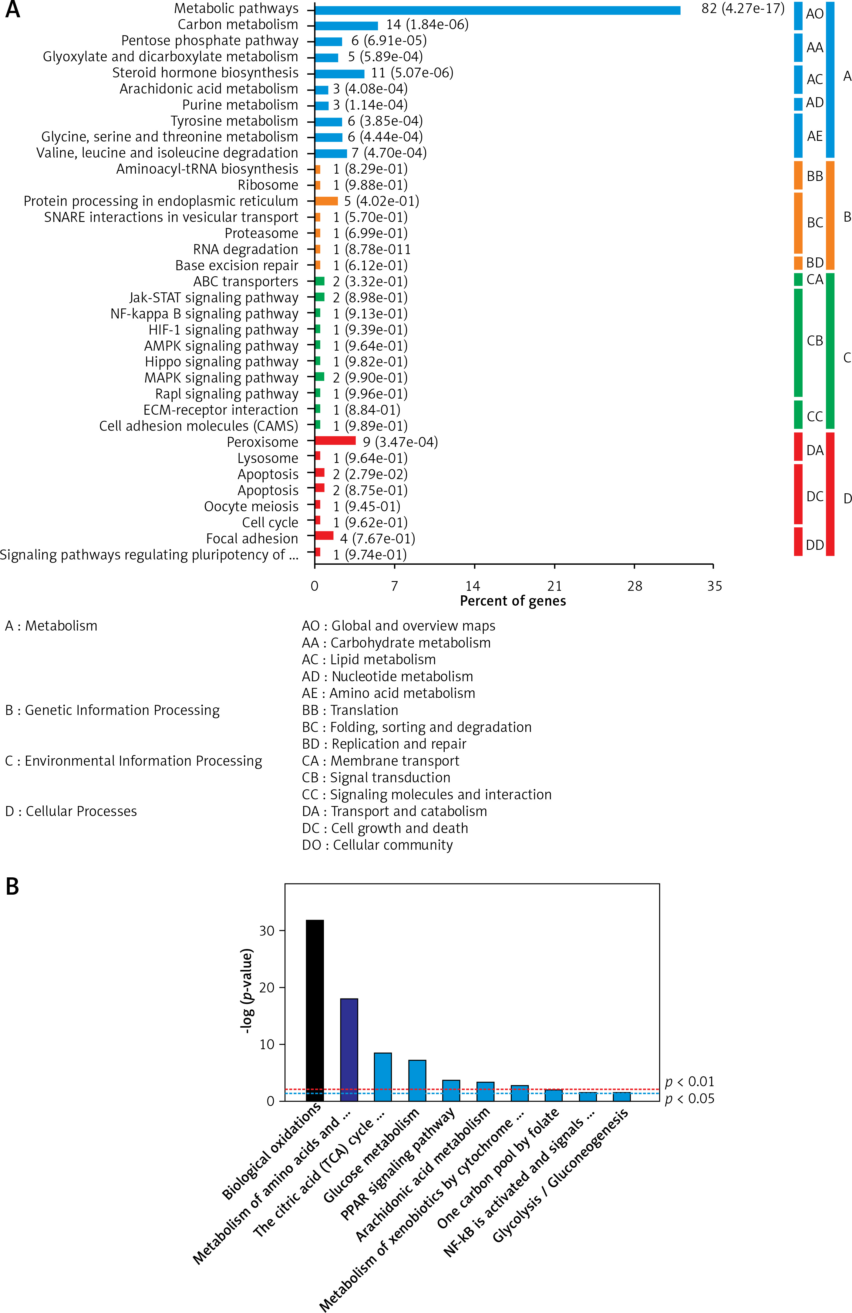 The key signalling pathways involved in the 2 groups. A – The key signalling pathways involved in the hepatocellular carcinoma tissues/distal noncancerous tissues group. B – The key signalling pathways involved in the adjacent noncancerous tissues/distal noncancerous tissues group. The top 10 enriched signalling pathways were displayed in the figures