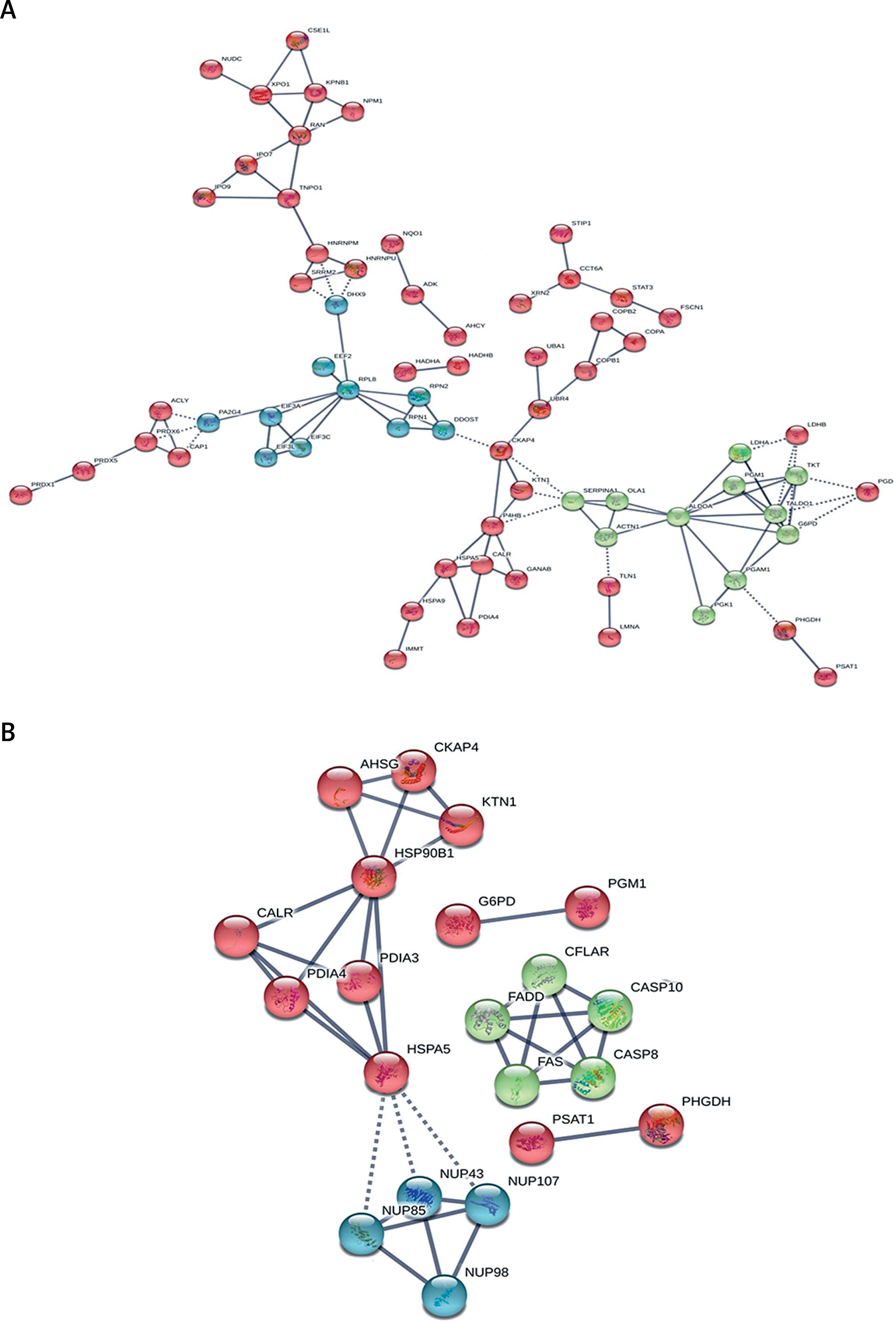 The interaction networks of differently abundant proteins in the 2 groups. A – The interaction networks of differently abundant proteins involved in the hepatocellular carcinoma tissues/distal noncancerous tissues group. B – The interaction networks of differently abundant proteins involved in the adjacent noncancerous tissues/distal noncancerous tissues group