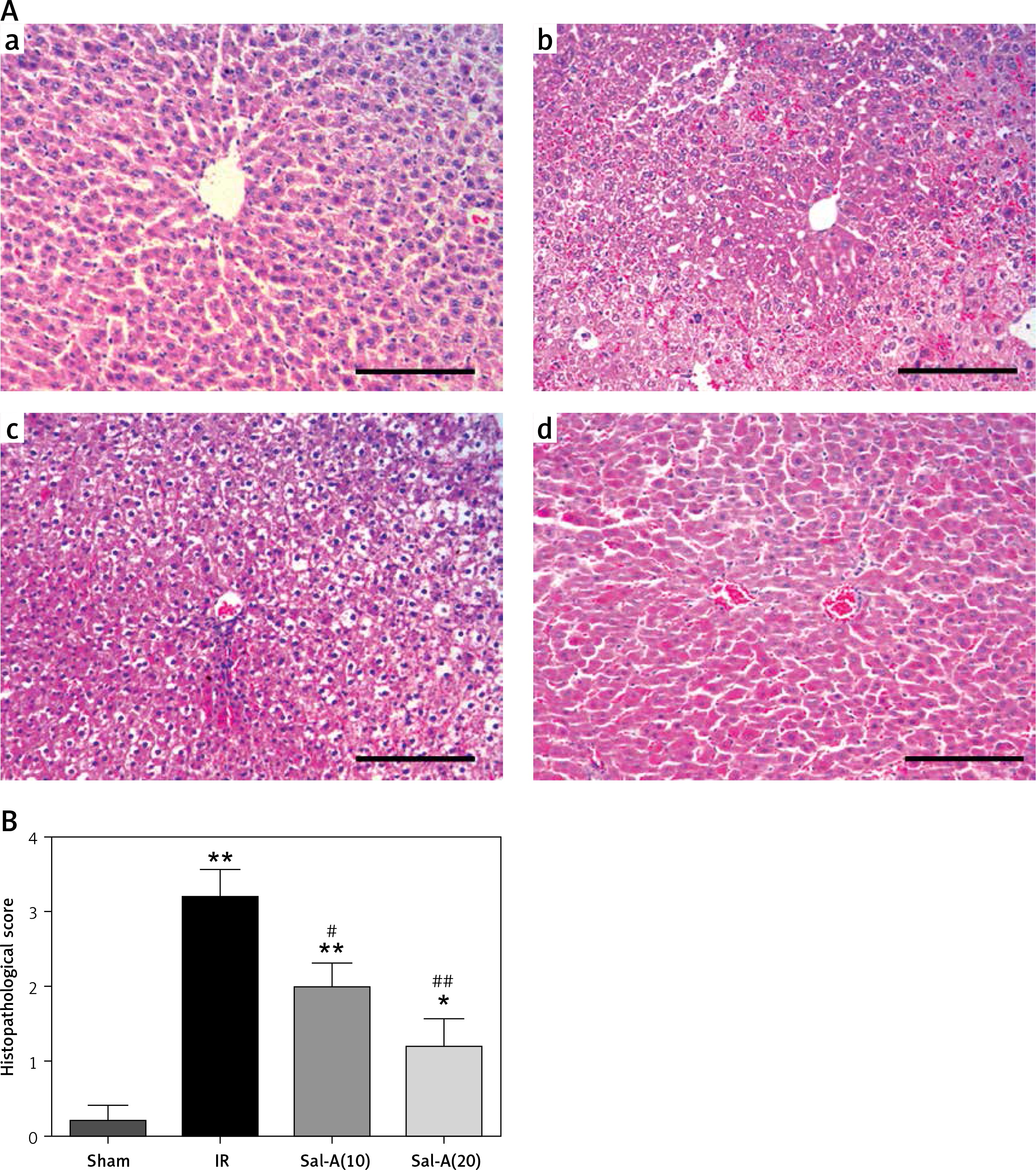 Histopathological examination of liver tissue. A – The liver histopathology changes (200×) in each group. a – Sham group, b – IR group, c – Sal-A(10) group, d – Sal-A(20) group. B – Liver histopathological scores for each group