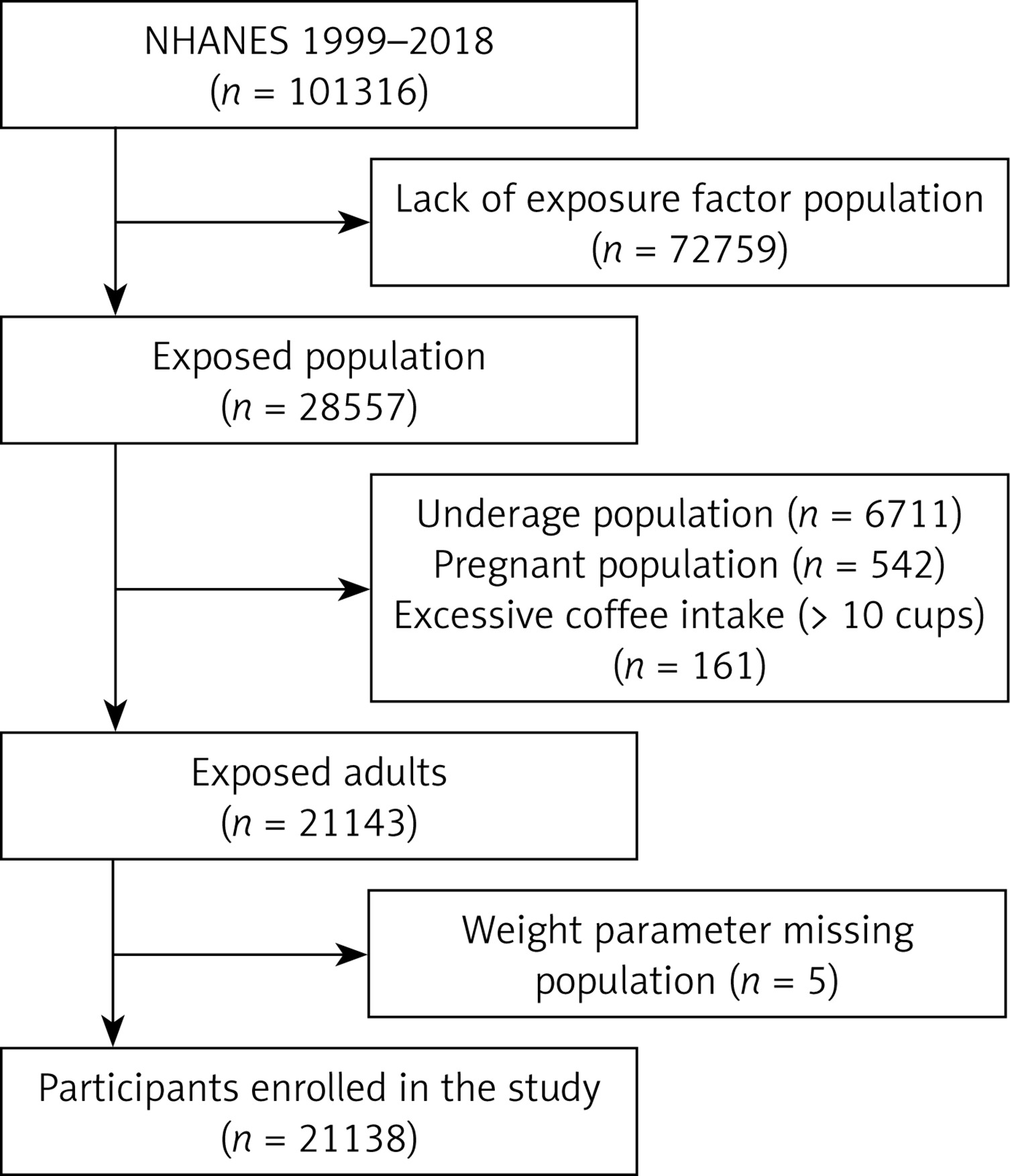 We extracted data on demographics, laboratory measurements, coffee intake, and comorbidities from the NHANES cycles spanning 1999 to 2018. Participants were included if they met the following criteria: (1) aged ≥ 20 years; (2) had complete coffee intake data; and (3) had available laboratory measures required for estimating IR. Initially, 21,846 individuals met these criteria. We further excluded participants who were pregnant (n = 542), had missing sample weight data (n = 5), or reported implausibly high coffee intake (> 10 cups/day, n = 161). This resulted in a final analytical sample of 21,138 participants.