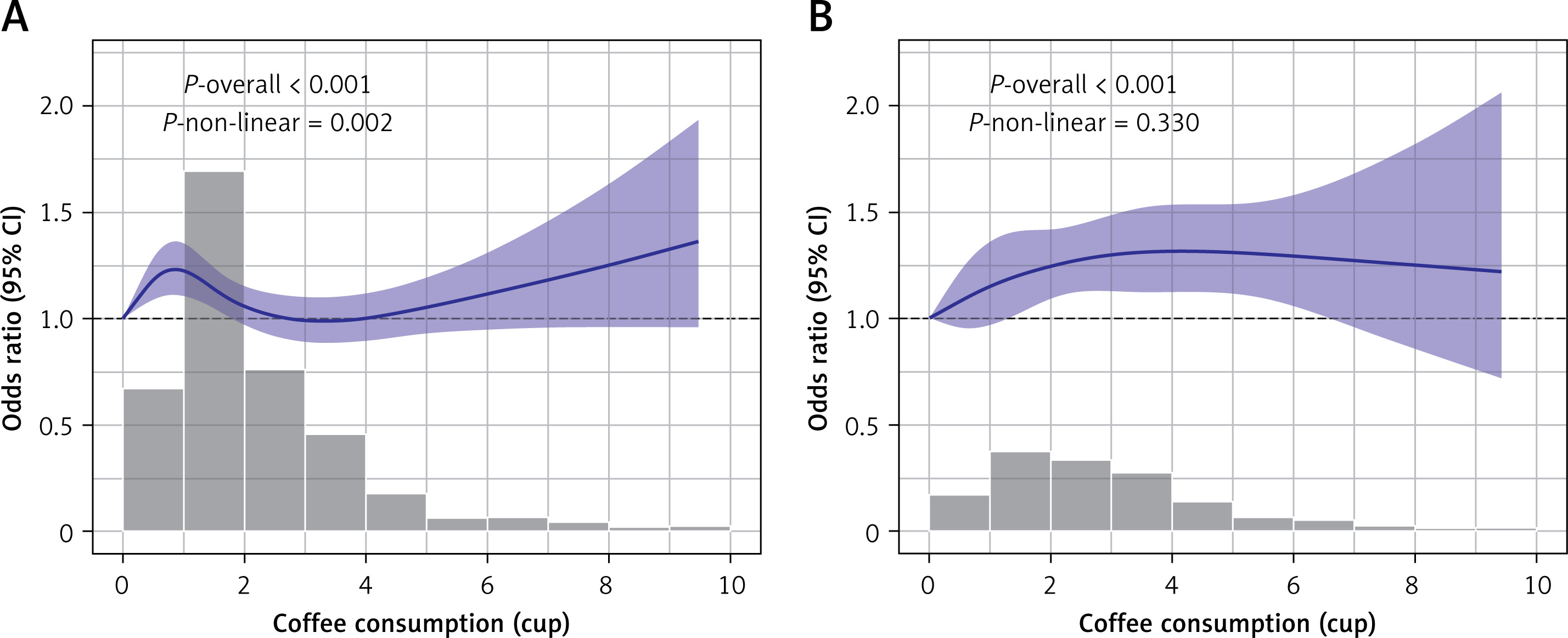 RCS analysis in different drinking patterns. Restricted cubic spline (RCS) curves showing the association between coffee intake and the odds of low GDR, stratified by drinking pattern. A – Morning-only coffee drinkers. B – All-day coffee drinkers