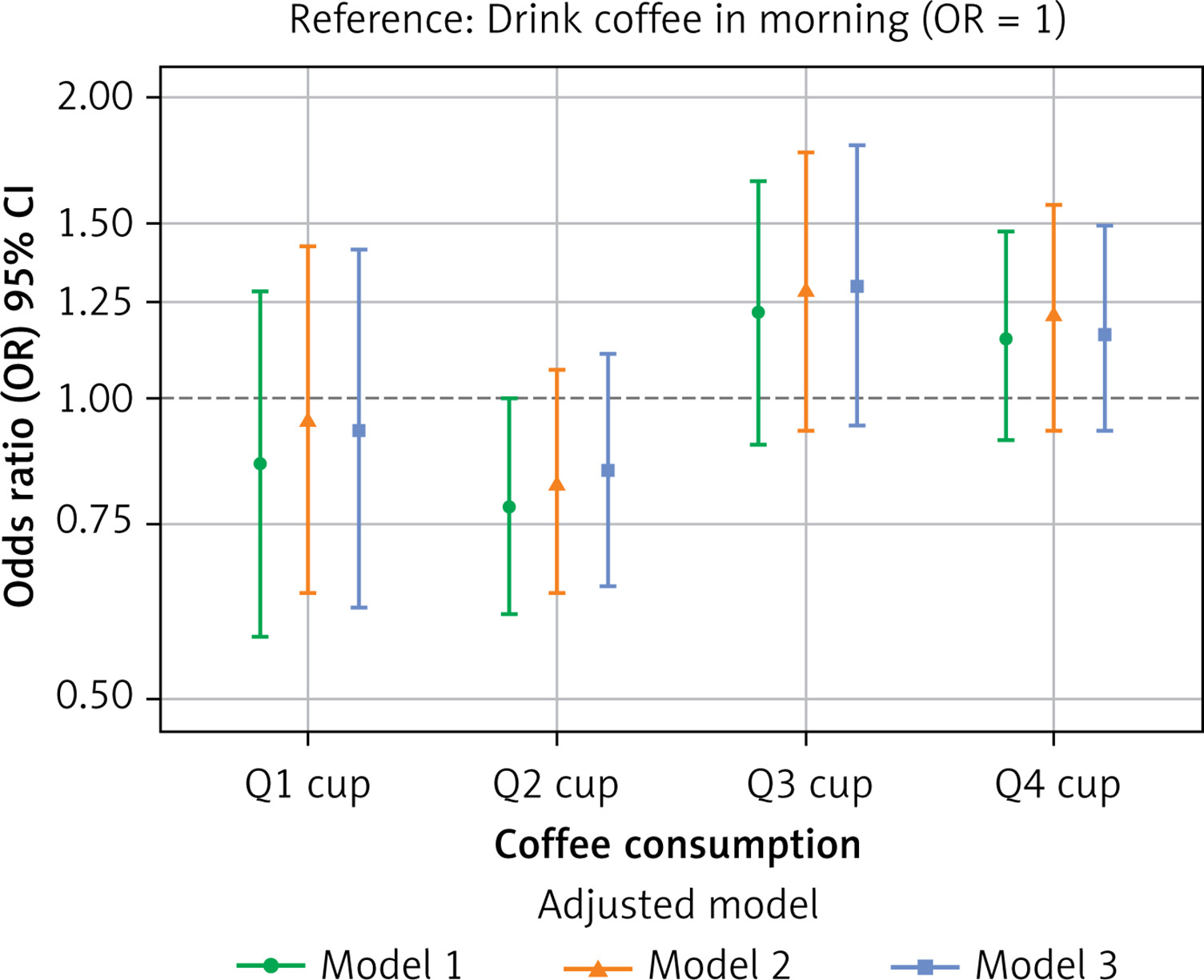 RCS analysis revealed a significant non-linear dose-response relationship between morning coffee intake and IR (p-nonlinear = 0.002; Figure 2 A). Morning intake showed an initial improvement in insulin sensitivity at lower doses, which diminished around 3 cups/day, followed by a potential resurgence of benefit at very high intakes. In contrast, the all-day intake pattern demonstrated a significant positive linear dose-response relationship (p-overall < 0.001, p-nonlinear = 0.330; Figure 2 B), indicating progressively greater benefit with higher intake. To directly compare the effects of intake timing at specific doses, multivariate logistic regression (Model 3) was used (Table III). For low-to-moderate intake (Q1–Q2: ≤ 2 cups/day), morning consumption showed a non-significant trend towards greater benefit compared to all-day consumption (Q1: OR = 0.93, 95% CI: 0.62–1.41; Q2: OR = 0.85, 95% CI: 0.65–1.11). Conversely, for higher intake levels (Q3–Q4: > 2 cups/day), all-day consumption showed a non-significant trend towards greater benefit (Q3: OR = 1.29, 95% CI: 0.94–1.79; Q4: OR = 1.16, 95% CI: 0.90–1.49). These results suggest a complex interaction between dose and timing, supporting the recommendation of morning consumption for lower amounts (≤ 2 cups/day) and distributing higher amounts (> 2 cups/day) throughout the day for optimal effects on insulin sensitivity (Figure 3, Table III).