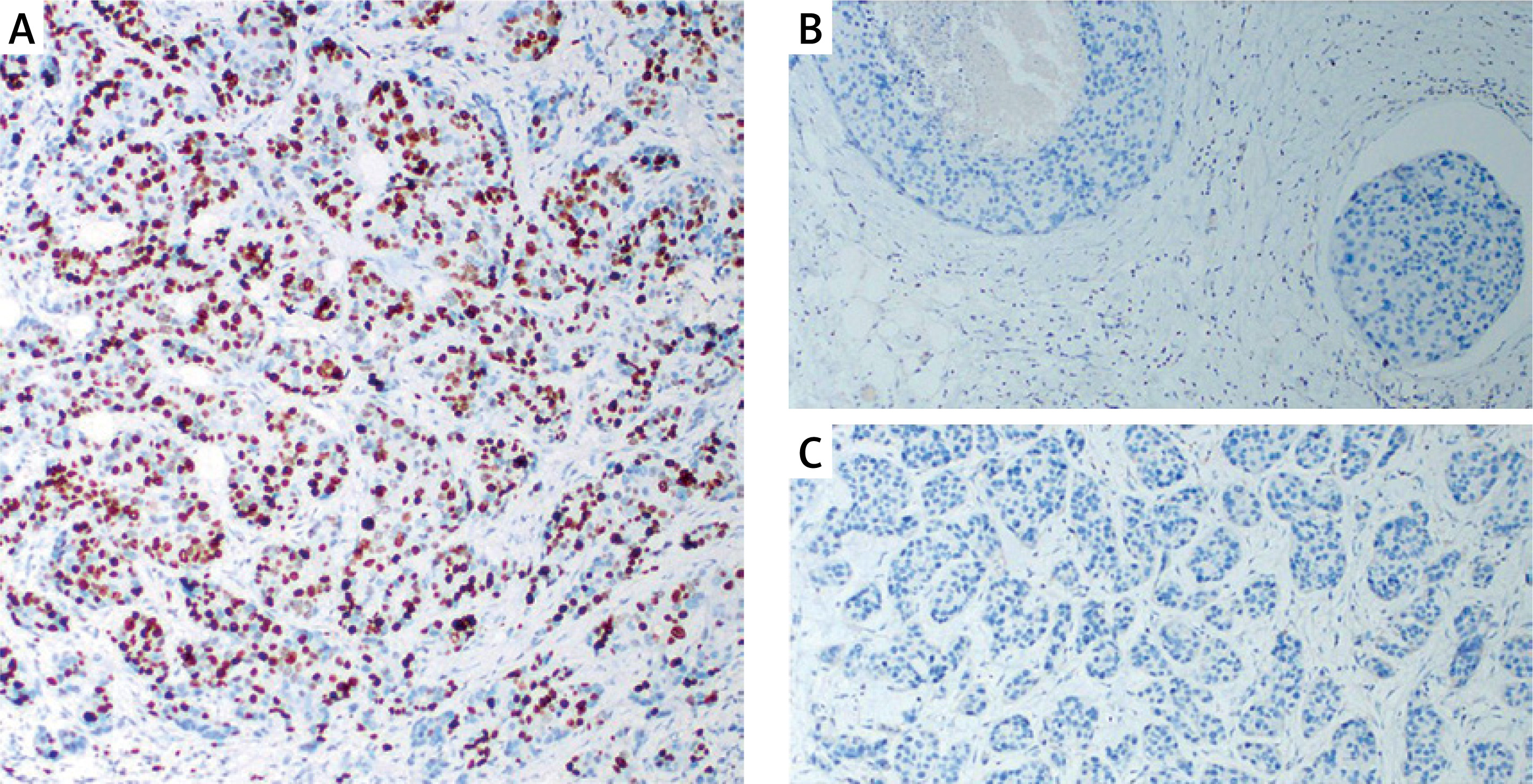 Tissue samples of ER, PR, and HER2 negative patients included in the study are shown in Figure 2. The materials of the cases included 17 tru-cut biopsies and 43 resections. The histopathologic diagnosis of invasive carcinoma (IDCC) was invasive carcinoma (IDC) with medullary pattern, and 95% of the cases had a Ki67 index as high proliferative activity.