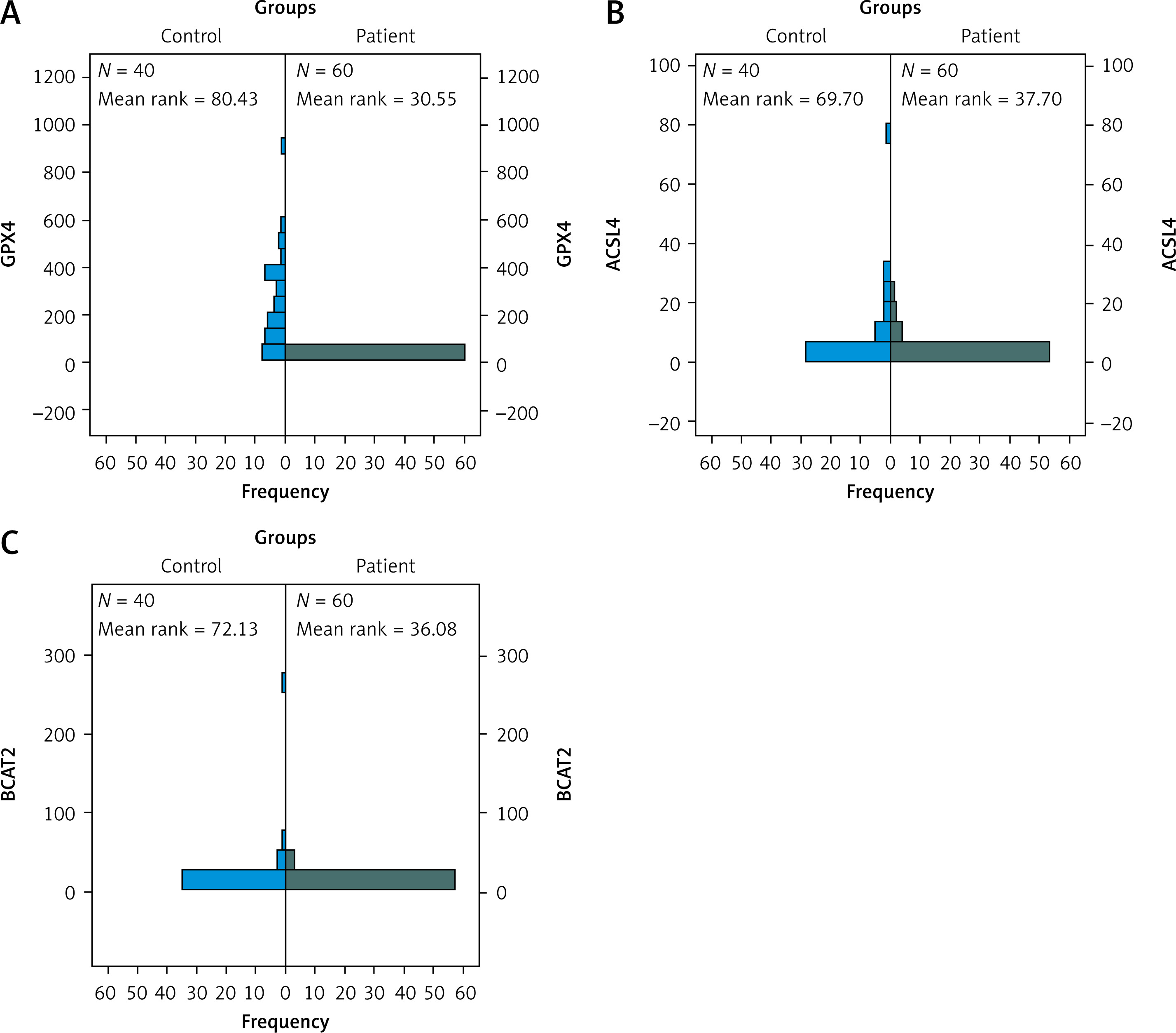 Gene expression levels of ACSL4, GPX4, and BCAT2 were significantly lower in the patient group than in controls (p = 0.0001 for all). See Table IV.