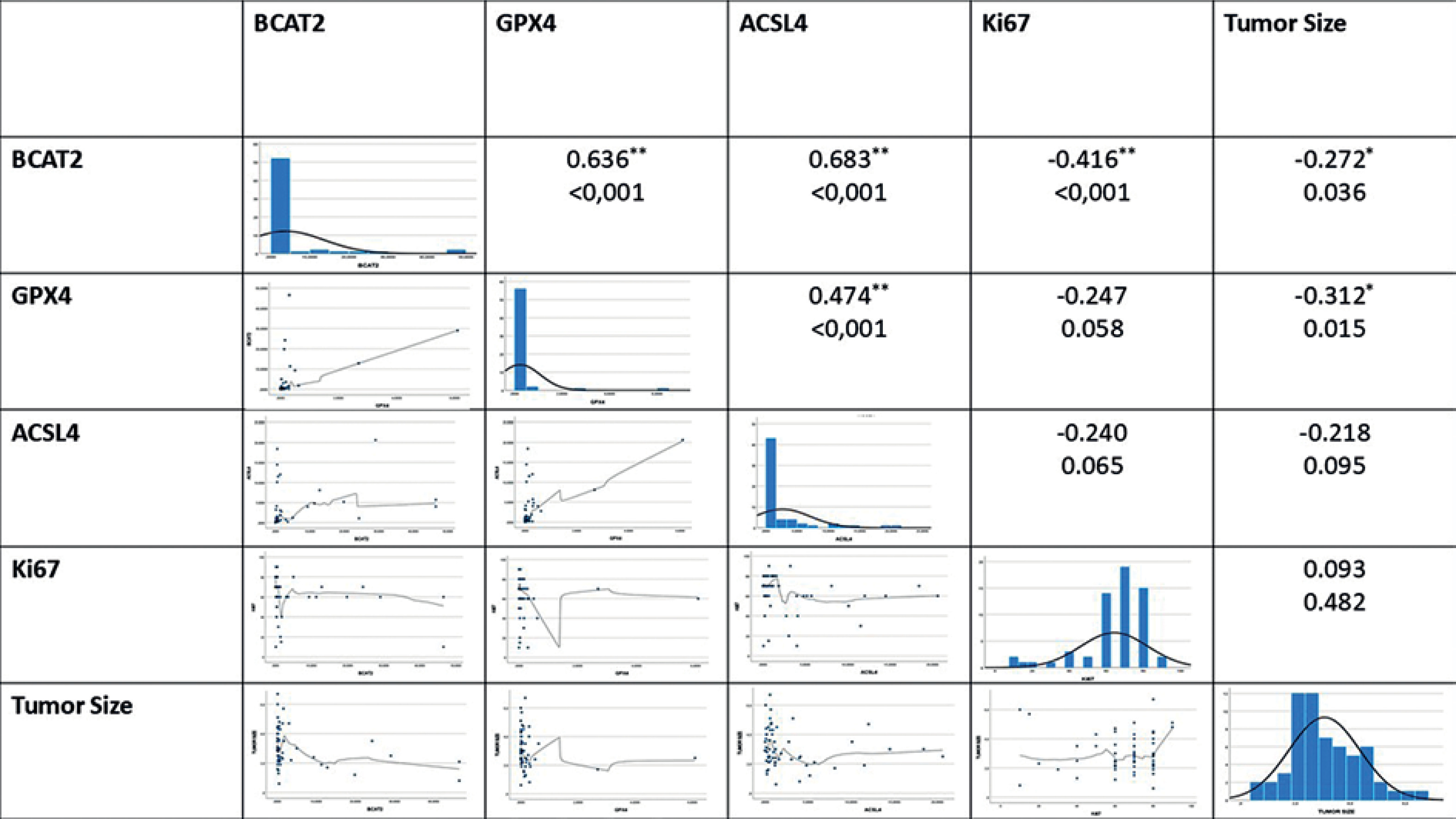 When the general results were examined, a significant negative correlation was found between BCAT2 and tumor diameter (p = 0.036, R = –0.272). Furthermore, there was a significant negative correlation between the proliferation marker Ki-67 and BCAT2 (p < 0.001, R = –0.416).