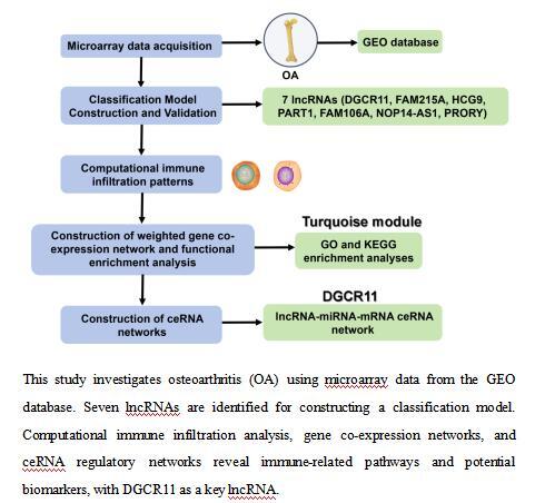 Microarray data from the Gene Expression Omnibus (GEO) database was used to identify differentially expressed genes (DEGs) in synovial tissue of OA. A classification model was constructed using the Least Absolute Shrinkage and Selection Operator (LASSO) regression with selected lncRNAs. Computational methods like CIBERSORT were employed to quantify immune cell infiltration patterns, and weighted gene co-expression network analysis (WGCNA) was conducted to delineate co-expression modules. Finally, a ceRNA network was constructed to elucidate the regulatory interactions among lncRNAs, miRNAs, and mRNAs.
