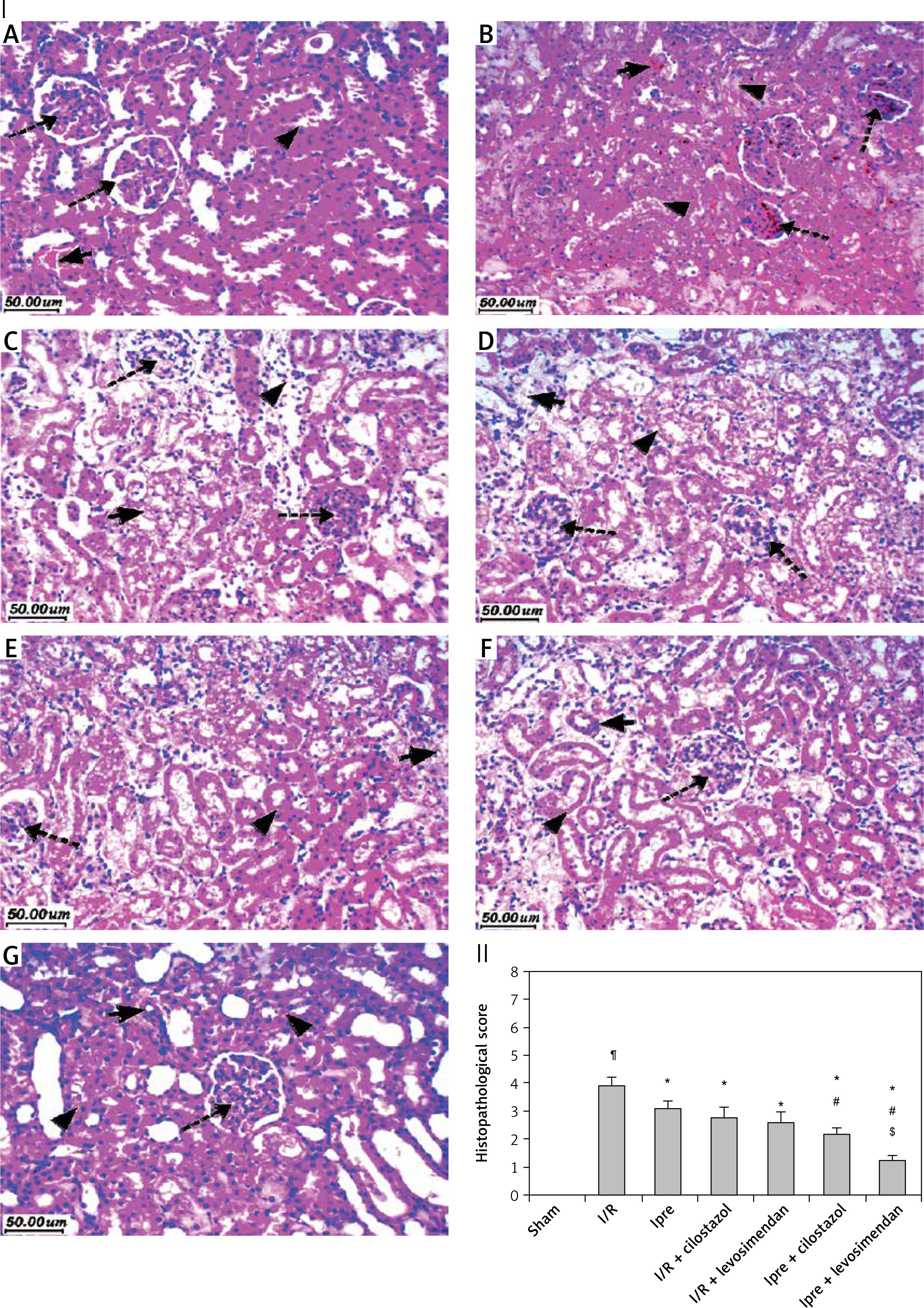 Microphotographs of renal tissues of sham, ischemia/reperfusion (I/R), ischemic preconditioning (Ipre), cilostazol or levosimendan groups (H&E 400×). I: Sham (A) showed normal glomeruli and tubular cells (dashed arrows). I/R group (B) showed marked interstitial hemorrhage (arrow), tubular epithelial degeneration (arrowhead) and shrunken glomeruli (dashed arrow) with moderate inflammatory infiltrate. Ipre group (C), I/R + cilostazol (D) and I/R + levosimendan (E) groups showed mild improvement. Ipre + cilostazol treated group (F) showed moderate improvement. Ipre + levosimendan treated group (G) showed preserved renal architecture. II. Histopathological score. Values are mean ± SD (n = 8–10), analyzed by one-way ANOVA followed by Tukey’s multiple comparisons test. ¶,*, #, $P < 0.05. ¶Compared to sham group. *Compared to I/R group. #Compared to Ipre group. $Compared to Ipre + cilostazol