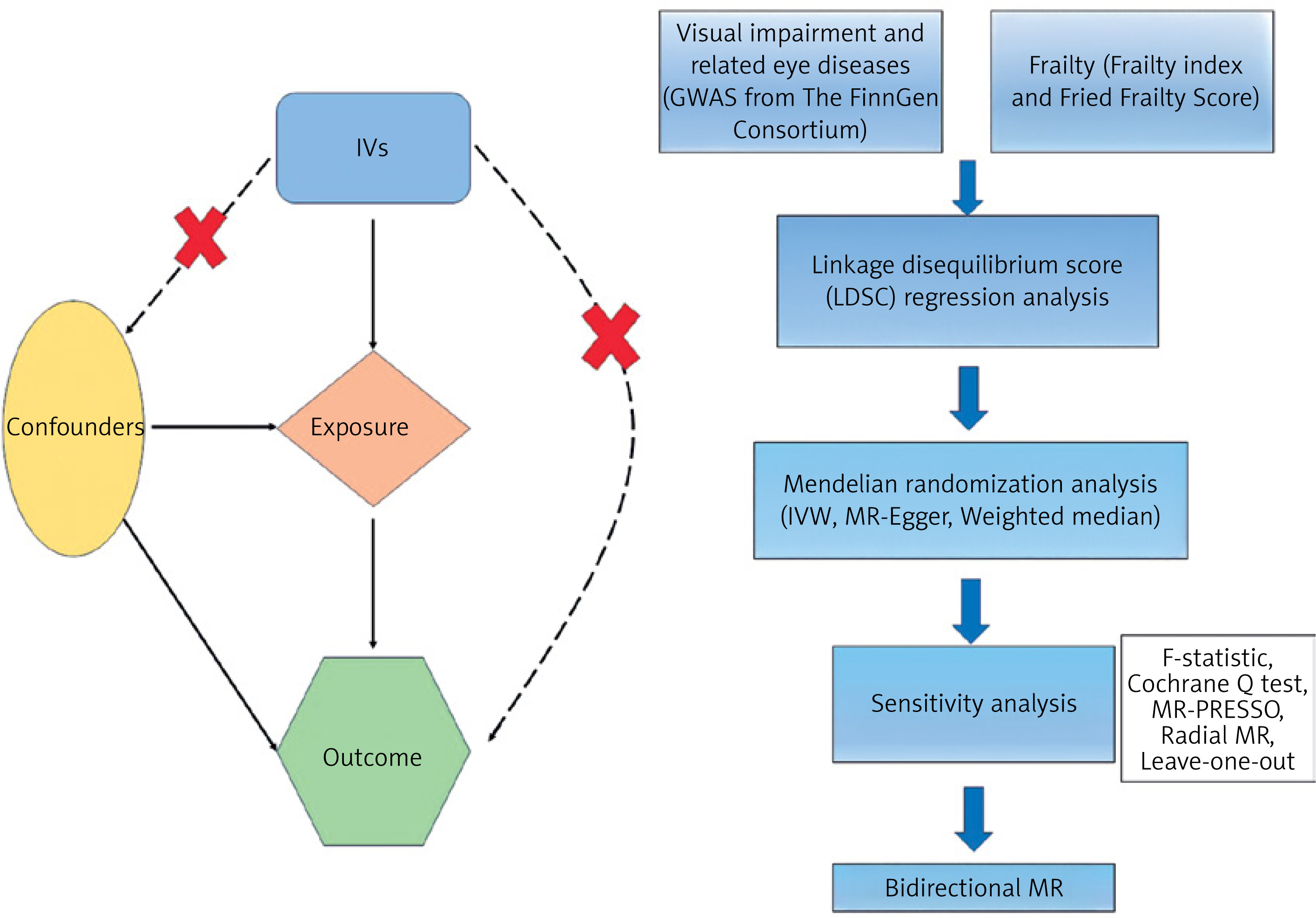 Recent studies have used genome-wide association studies (GWAS) to estimate trait correlations and causality. Linkage disequilibrium score regression (LDSC) leverages GWAS summary statistics to assess genetic associations [19]. Mendelian randomization (MR) infers causal relationships between variables using genetic variation [20]. Genotype precedes phenotype, and alleles are randomly allocated at conception; therefore, genetic variation may be used to evaluate causality without reverse causality interference or confounding bias [21, 22]. This study thus investigated causal relationships and the genetic correlation between genetically predicted VI and frailty using MR and LDSC.
