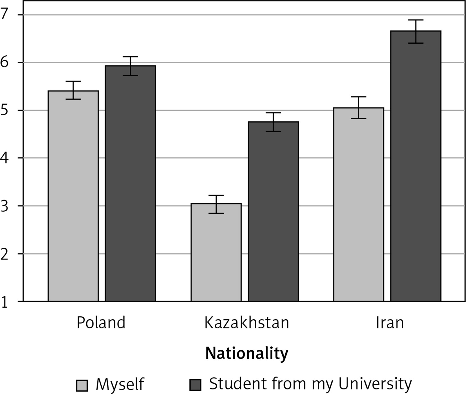 Also, a significant interaction effect was found: depending on the nationality, the respondents assessed the risk of infection differently for themselves and another student from their university. To assess the complexity of the results, an analysis of the simple main effects of 2 measurements of unrealistic optimism by nationality was conducted. It turned out that this effect occurred for all nationalities. Thus, among Poles, the estimation of own risk of falling ill was smaller (M = 5.42; SD = 2.42) than the estimate of the chance of another student from the university getting ill (M = 5.93; SD = 2.23) (pbonf < 0.001). The situation was similar in Iran. The estimation of the risk of own illness was smaller (M = 5.06; SD = 2.59) than the estimate of the chance of another student from the university getting ill (M = 6.66; SD = 2.49) (pbonf < 0.001). There was no exception in Kazakhstan. The estimation of own risk of falling ill was smaller (M = 3.04; SD = 2.27) than the estimate of the chance of another student from the university getting ill (M = 4.76; SD = 2.64) (pbonf < 0.001). Detailed results are shown in Figure 1.