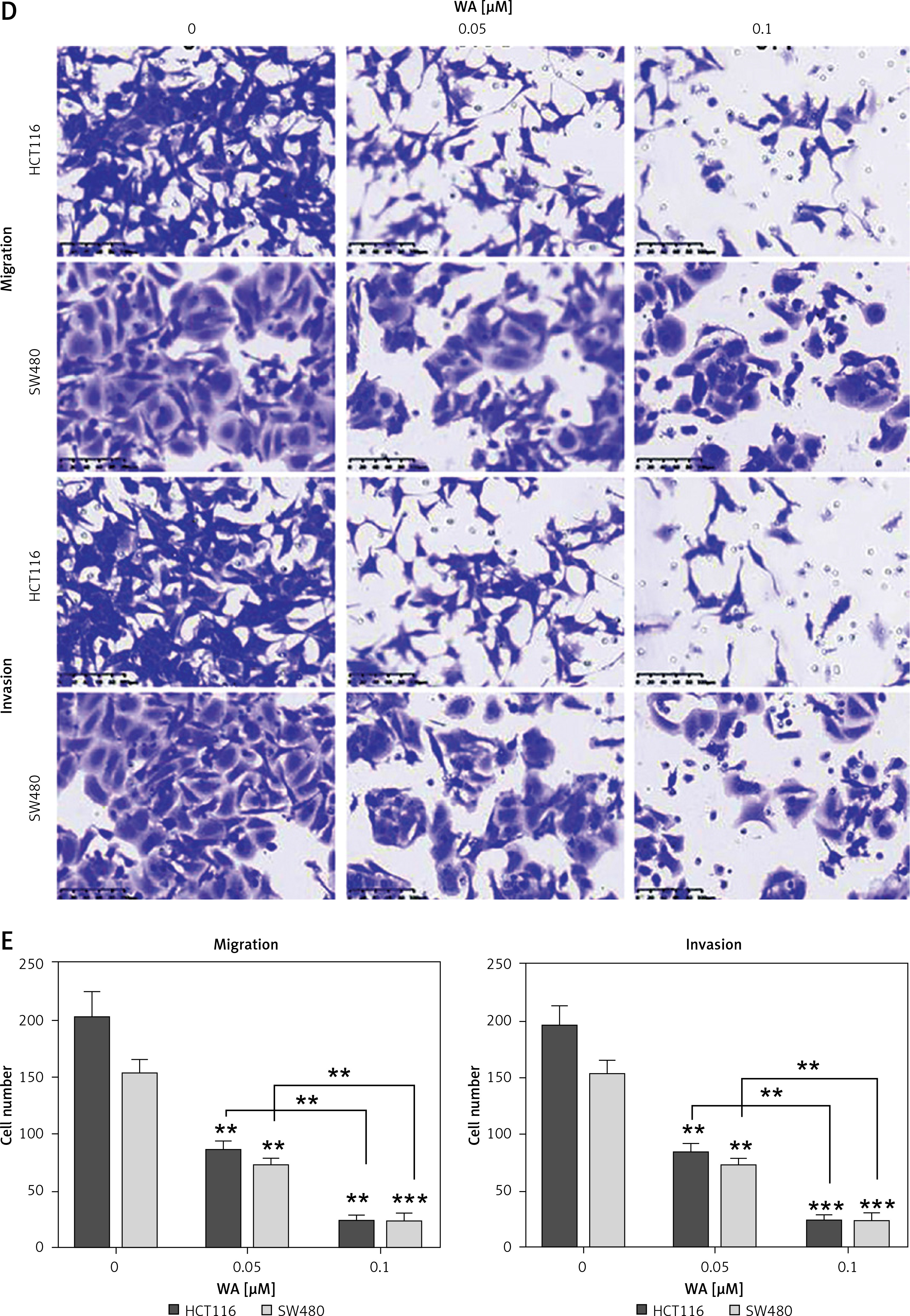 WA inhibits the growth, invasion and migration of CRC in vitro. A – CRC cells were treated with specified concentrations of WA for 24 h and then CCK8 was used for the cell viability analysis. The data were obtained from three independent experiments. B – HCT116 and SW480 cells were treated with specified concentrations (0, 0.05 and 0.1 μM) of WA for 12 days. The colony was fixed and then stained. C – Data come from three independent experiments (B), *p < 0.05, **p < 0.01, ***p < 0.001. D – Migration and invasion assays were used to detect the influence of WA on the migration and invasion ability of CRC cells, respectively. E – Data come from three independent experiments. These experiments were performed three times independently, *p < 0.05, **p < 0.01, ***p < 0.001