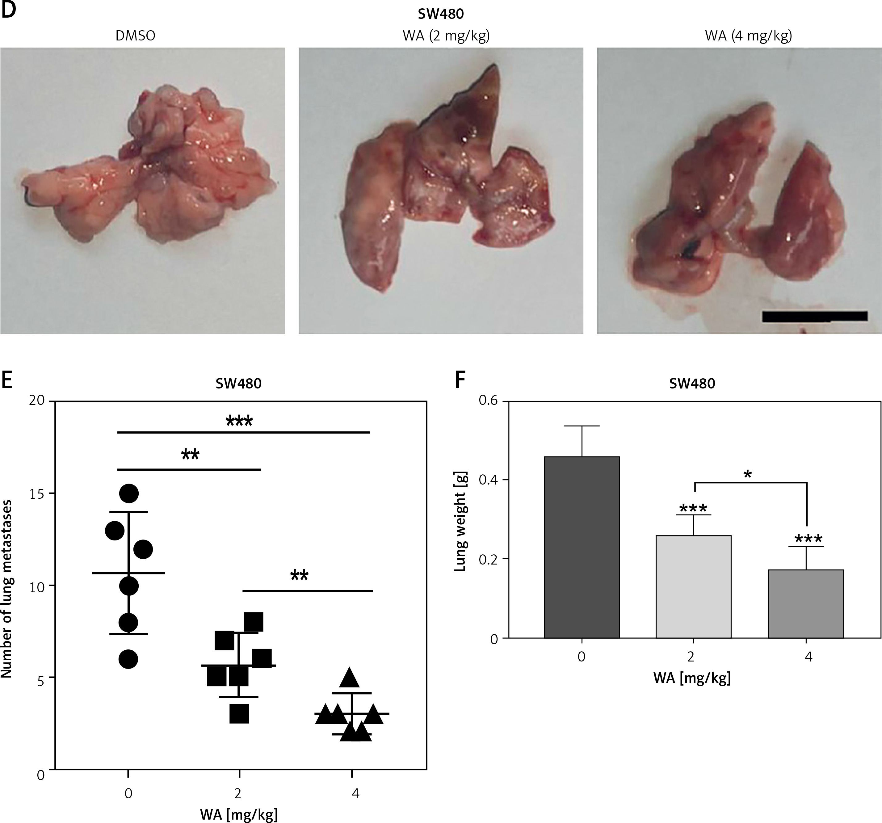 WA inhibits the growth and metastasis of CRC in vivo. A–C – SW480 cells were subcutaneously inoculated into nude mice. The mice were randomly divided into 3 groups (n = 6), and intraperitoneal injections of DMSO, WA 2 mg/kg, WA 4 mg/kg were injected into different groups daily for 30 days. A – Tumor volume measurement. B – Subcutaneous tumor tissue of the 3 groups. C – Tumor mass measurement. The scale bar is shown in the figure. D–F – Lung metastasis model after injection of SW480 cells via tail vein. They were randomly divided into 3 groups (n = 6), and intraperitoneal injections of DMSO, WA 2 mg/kg, WA 4 mg/kg were administered to different groups daily for 30 days. D – Representative images of metastatic lung tumors. E – Quantification of metastatic lung tumors. F – Measurement of the weight of the whole lung. Scale bar, 1 cm. *p < 0.05, **p < 0.01, ***p < 0.001