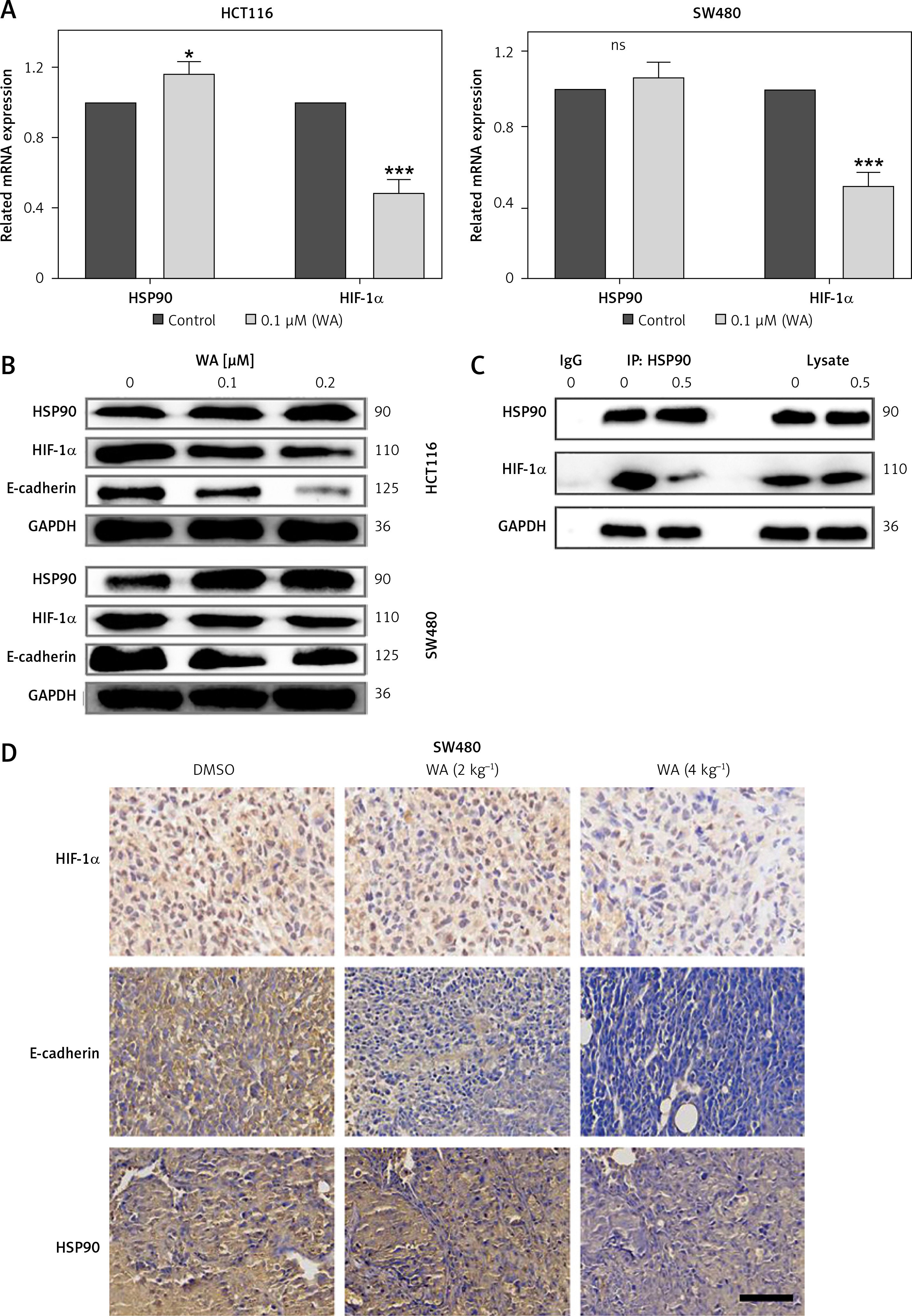 WA inhibits HSP90/HIF-1α pathway of CRC. A – Treatment of CRC cells with WA at the specified concentration for 12 h, and qPCR detection of related mRNA expression levels. B – After treating CRC cells with DMSO or WA at the specified concentration for 24 h, western blotting analysis was used to detect the expression level of proteins, including HSP90, HIF-1α, and E-cadherin. C – SW480 cells were treated with 1 μM WA or without 1 μM AIL for 24 h. They were then treated with HSP90 antibody IP, and the specified antibody was used to detect the co-immunoprecipitated protein. D – Representative images of immunohistochemical detection of HSP90, HIF-1α, and E-cadherin in CDX tumor tissue (400×). Scale bars, 50 μm. These experiments were performed three times independently, *p < 0.05, **p < 0.01, ***p < 0.001