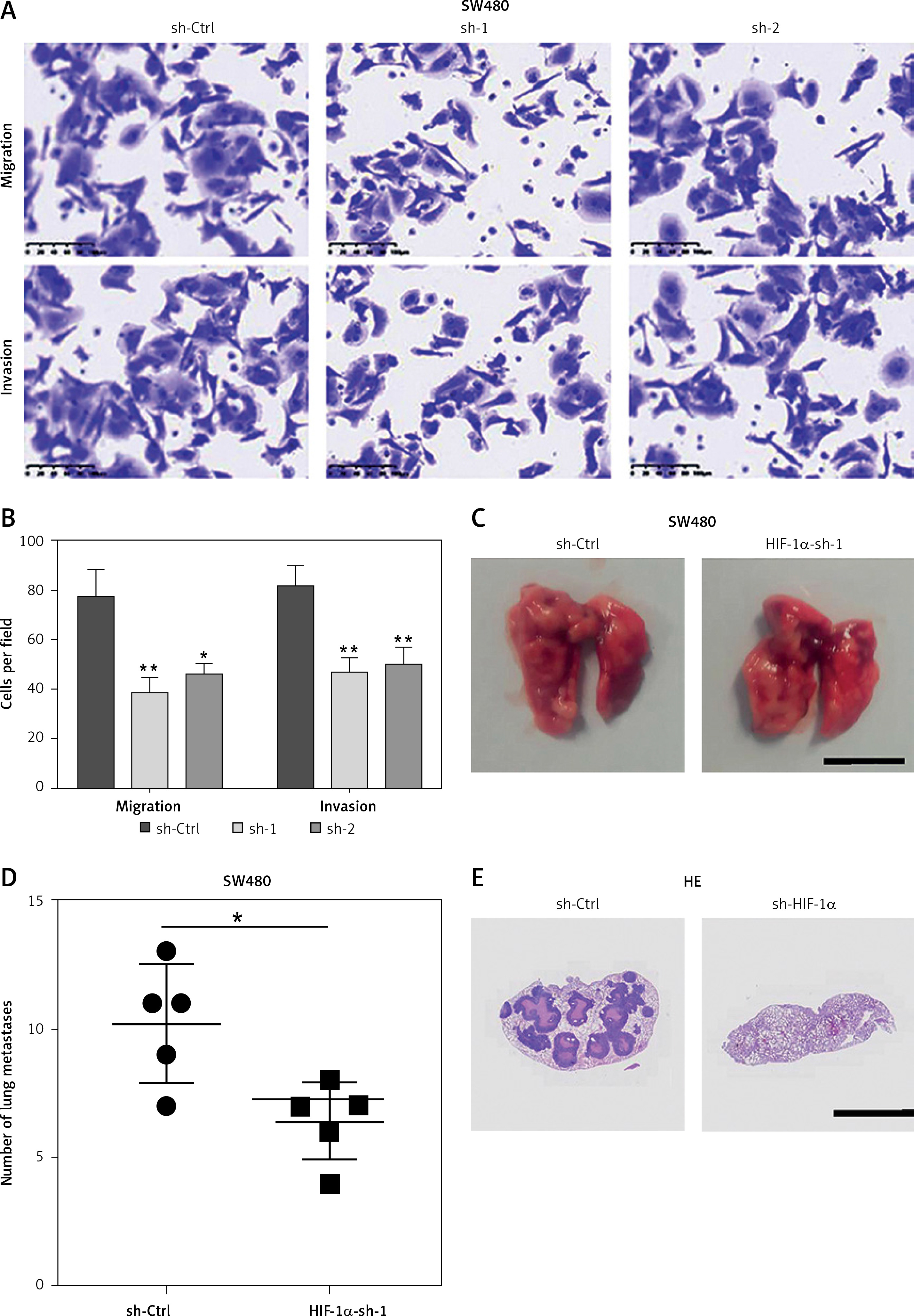 HIF-1α is an important protein that promotes tumor metastasis. A – Migration and invasion ability of sh-Ctrl, HIF-1α-sh1 and HIF-1α-sh2 in the SW480 cells. B – The data come from three repeated experiments (A), C – Representative images and quantitative analysis of metastatic lung tumors after injection of knockdown HIF- 1α or control group SW480 cells. D – The data come from three repeated experiments (C). E – Representative images of metastatic lung tumors with HE staining. Scale bar, 1 cm. These experiments were performed three times independently, *p < 0.05, **p < 0.01