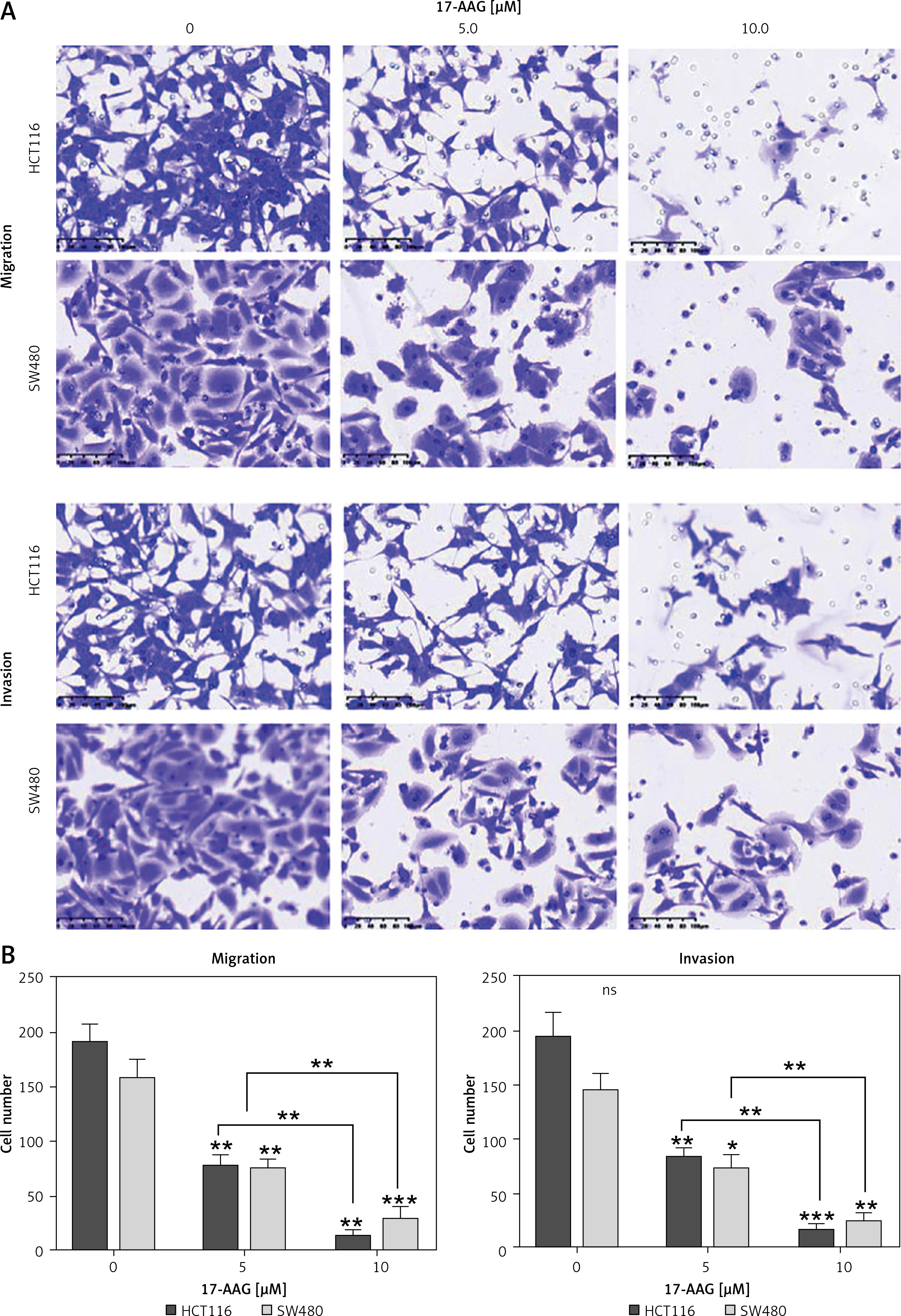 To explore whether HSP90 has a regulatory relationship with HIF-1α, we introduced 17-AAG, a classic inhibitor of HSP90. We found that 17-AAG can shut down the migration and invasion of these CRC cells (Figure 6 A). 17-AAG can inhibit the HIF-1α mRNA level (Figure 6 B) and protein expression level (Figure 6 C) of CRC. These results indicate that HSP90 can stabilize and regulate HIF-1α.