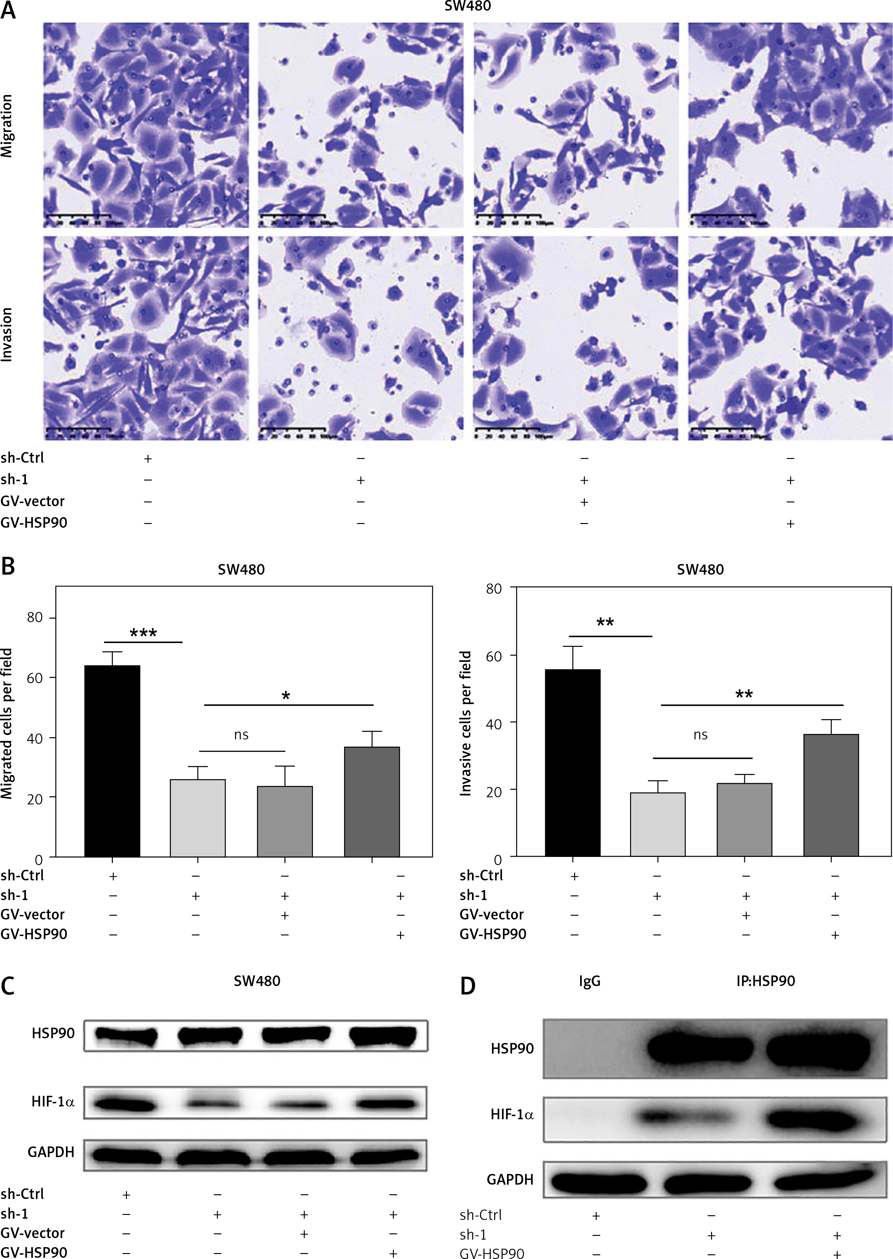 HSP90/HIF-1α signal axis promotes migration and invasion of CRC cells. A – Migration and invasion ability of sh-Ctrl, HIF-1α-sh1, HIF-1α-sh1 + GV-Vector and HIF-1α-sh1 + GV-HSP90 in the SW480 cells. B – Data come from three independent experiments (A). C – Western blotting was used to detect the HIF-1α protein expression levels of sh-Ctrl, HIF-1α-sh1, HIF-1α-sh1 + GV-Vector and HIF-1α-sh1 + GV-HSP90. D – Co-IP detects expression level of HIF-1α in HSP90 knockdown HIF-1α-sh1, HIF-1α-sh1+GV-HSP90. These experiments were performed three times independently, *p < 0.05, **p < 0.01, ***p < 0.001
